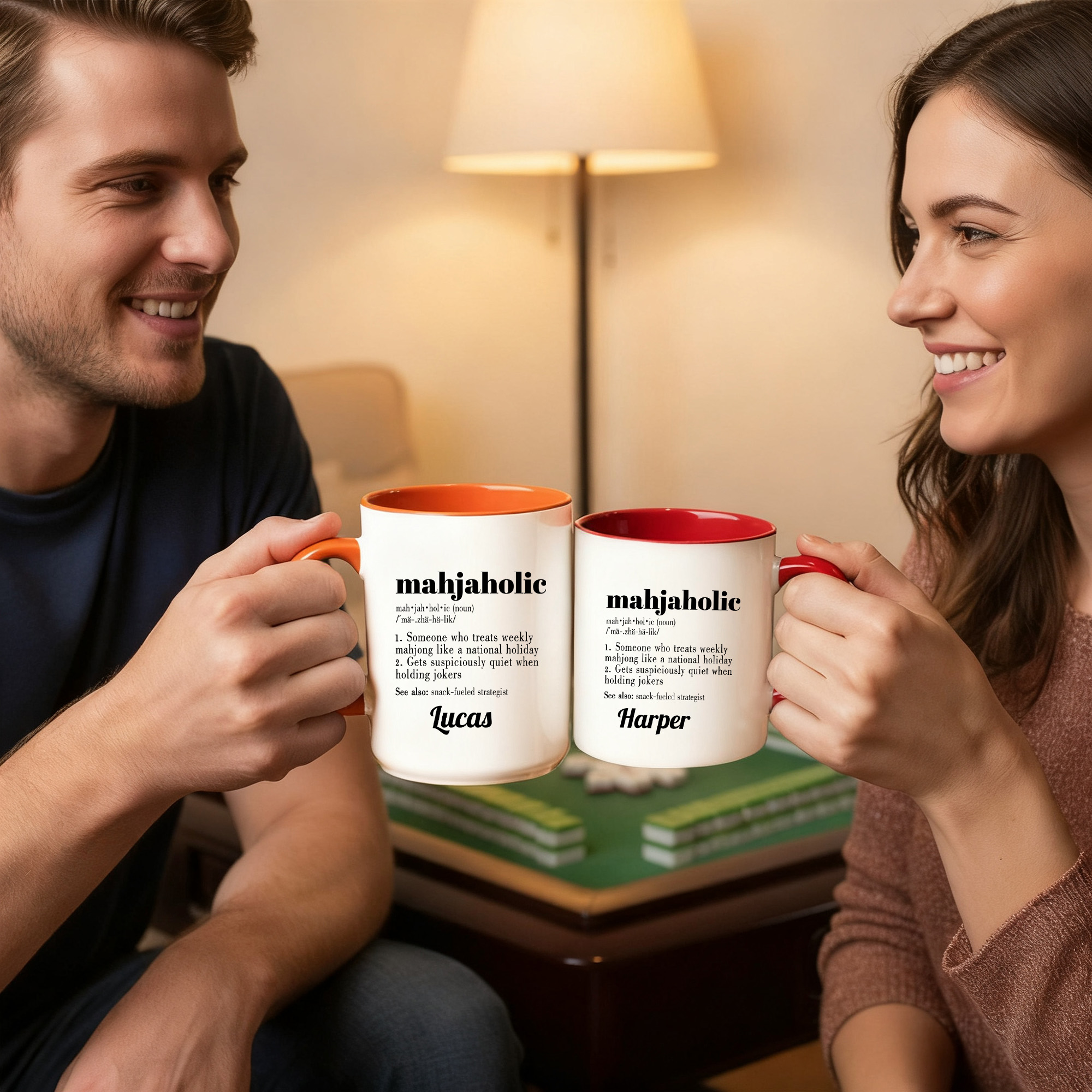 Mahjaholic Definition Design - This two-tone ceramic mug features a funny “Mahjaholic” definition that celebrates the joy of Mahjong in a playful way. Its bright interior & handle color and clean layout give it a lively, modern look that stands out on any table.